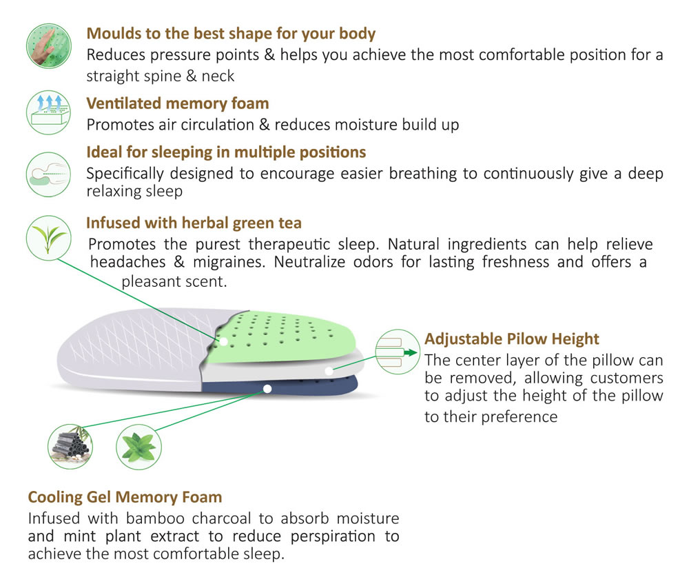 A luxurious premium quality reversible pillow with patented technology of herbal infusion memory foam that help users achieve a deep relaxing sleep like no other pillow before it.